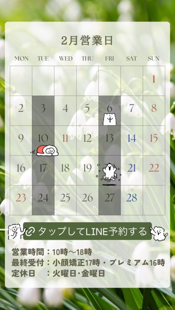 お知らせ営業日・ご予約📅pickup営業時間:10時~18時 最終受付時間小顔矯正 :17時プレミアム(小顔+毛穴):16時 定休日:火曜日・金曜日 ご予約は公式LINEからお願いいたします👇🏻 ...2026.01.20 -