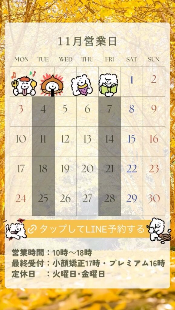お知らせ営業日・ご予約📅pickup営業時間:10時~18時 最終受付時間小顔矯正 :17時プレミアム(小顔+毛穴):16時 定休日:火曜日・金曜日 ご予約は公式LINEからお願いいたします👇🏻 ...2025.10.21 -